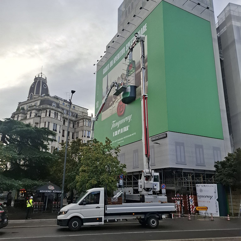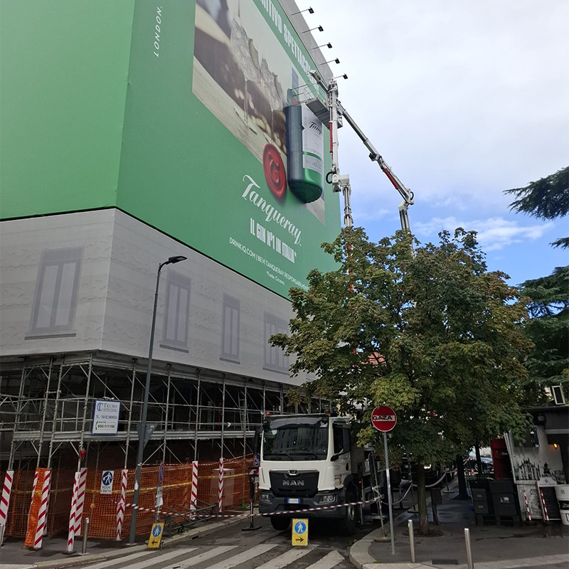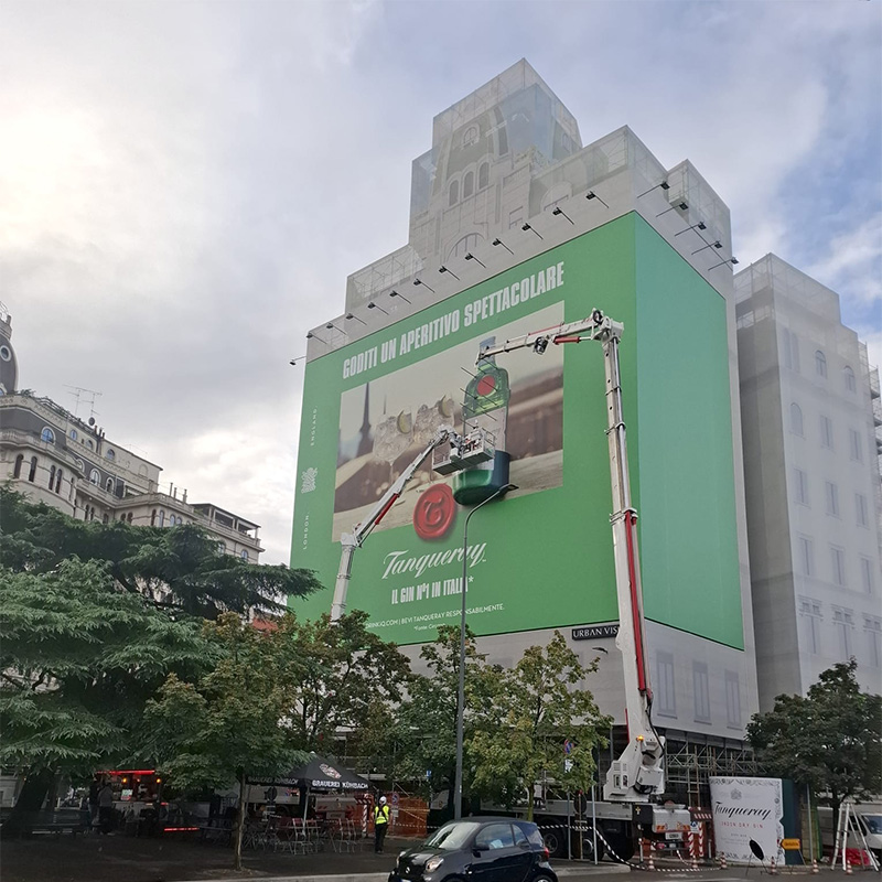 Precision, speed, and safety: these were the key elements of the work carried out by AMIP SRL on behalf of Urban Vision Group in Piazza Piemonte, Milan, where a building under renovation was entirely covered by a spectacular visual installation dedicated to the famous Tanqueray gin.